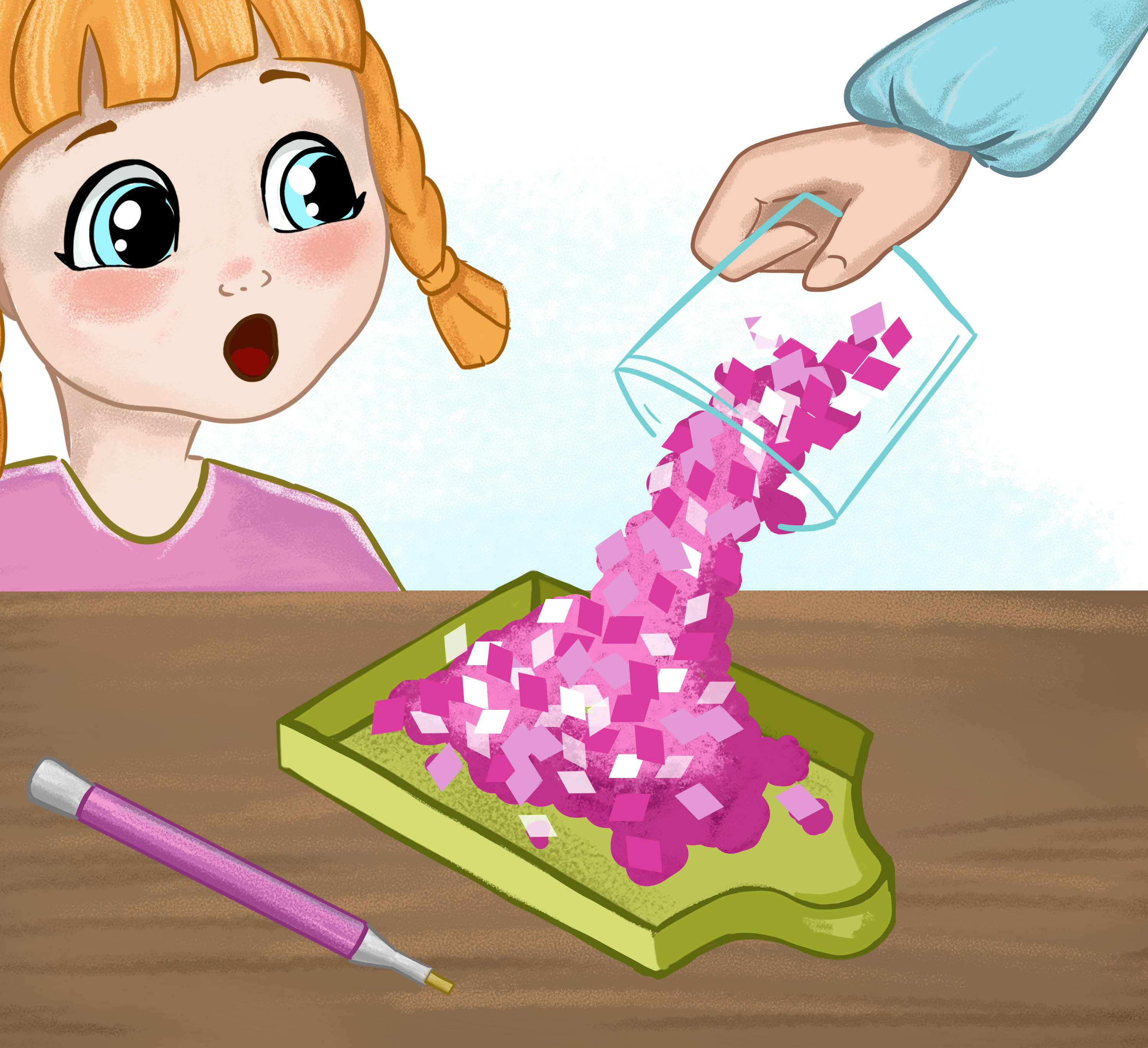 Giet de diamanten in het schudbakje en schud lichtjes zodat de steentjes goed liggen.